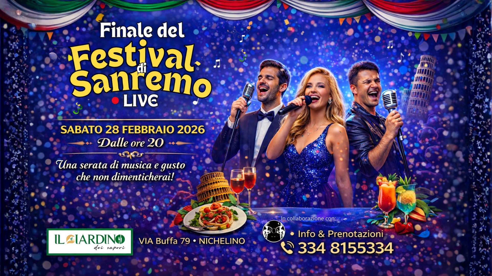 Una serata speciale da vivere insieme tra musica, convivialità e sapori autentici. Scegli la formula che preferisci e goditi la cena animata con la Finale del Festival di Sanremo.
